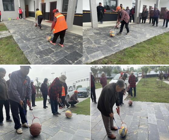第一輪游戲結(jié)束后,接著是“趕豬進(jìn)欄”,同樣是安排兩人一組競賽。參賽老人在起點(diǎn)用羽毛球拍趕“豬”(籃球),將豬趕向終點(diǎn),趕“豬”途中如果用手幫忙或者偏離跑道則不計(jì)算成績,按照用時(shí)長短依次排名。現(xiàn)場的張阿姨聚精會(huì)神、屏住呼吸看著目標(biāo)物手持羽毛球拍、趕著籃球,其它老人也躍躍欲試。