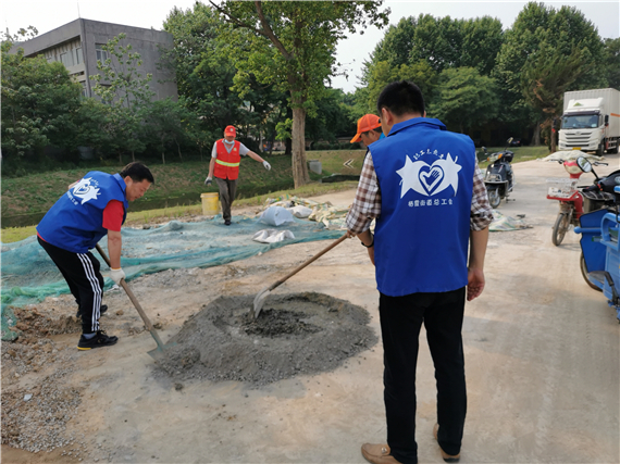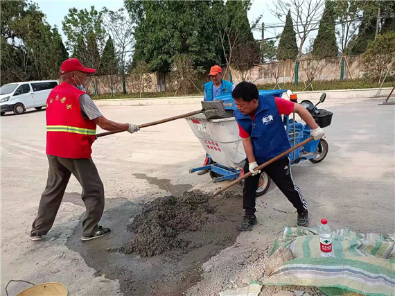 社區(qū)積極協(xié)調、多方溝通,面對路面的“不平”, 志愿者們帶上了鐵鍬、泥土沙石等工具主動當起了修路工人,掄著鐵鍬將路面上的碎石敲開、清理,然后用水泥攪拌著細沙將凹陷處澆灌、填滿、鋪平,最后再用平鏟敲打嚴實。經過大家的努力,路面恢復了平整,交通也變得更加順暢了。