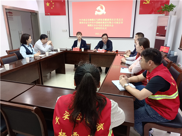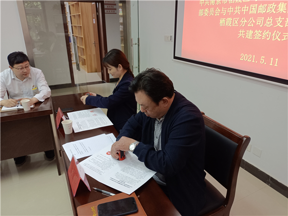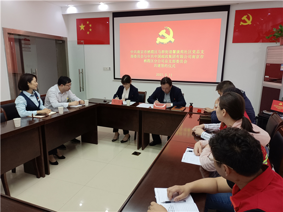 為進一步深化黨史學習成效,更好地服務轄區(qū)居民。5月11日上午,南京市棲霞區(qū)馬群街道馨康苑社區(qū)黨總支與中國郵政集團有限公司南京市棲霞區(qū)分公司黨總支共建簽約儀式在社區(qū)二樓會議室隆重召開,進一步拓寬基層黨建新路徑的同時,謀劃了區(qū)域內社企黨組織合作共贏新篇章。當天,共建雙方黨總支書記、委員與黨員代表參加了本次活動。