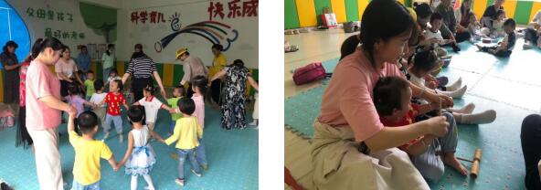 活動(dòng)中還安排了早操、自我介紹、音樂課、互動(dòng)游戲等環(huán)節(jié),嬰幼兒們聽隨笑笑老師的指令,認(rèn)真完成拍小鼓,敲擊雙響筒等有利于激發(fā)孩子們音樂細(xì)胞的小游戲,孩子們爭取贏得表示夸贊的小紅花。短短一小時(shí)的親子活動(dòng)轉(zhuǎn)瞬即逝,在家長的陪同下,嬰幼兒們玩得不亦樂乎,現(xiàn)場其樂融融,十分幸福和諧。