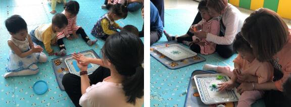 本次活動共吸引了社區(qū)11組家庭前來參與。活動現(xiàn)場,笑笑老師帶領(lǐng)寶寶們復(fù)習(xí)上一節(jié)課的模仿“小動物走路”游戲,“小烏龜是怎么走路的呀?”笑笑老師問。小朋友們一同回答道:“小烏龜走路爬呀爬”,小朋友們相比之前對環(huán)境更熟悉了,也更開朗。有的小朋友還學(xué)小烏龜走路,在地上爬、翻滾,家長們也在旁拿出手機(jī)記錄自家寶寶成長的一幕。到了自我介紹環(huán)節(jié),有位小朋友還沉浸在上一環(huán)節(jié),迷迷糊糊介紹道:”我是小烏龜……”引得現(xiàn)場的老師家長們?nèi)炭〔唤?。隨后,笑笑老師教小朋友們做泥塑,小朋友們在家長的協(xié)助下將橡皮泥搓圓捏扁。經(jīng)過各色橡皮泥的搭配和組合,一個個精美的泥塑成型了,有葡萄、草莓、香蕉等等。