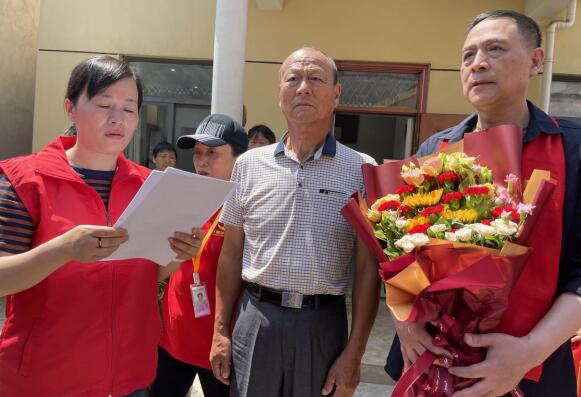 原來,今年74歲的張安保有個小他十歲的弟弟,因為一次自然災害,兄弟倆自此失散,這一別就是61年。1999年,已經(jīng)長大成人的賀獻林開啟了他的長達23年的尋親之旅。就在前段時間,賀獻林得到好消息,在尋親志愿者的幫助下,在南京找到了他的家人。為了幫助他們兄弟倆團圓,在尋親志愿者的聯(lián)系下,社區(qū)工作人員了解前因后果,在看到尋親志愿者提供的賀獻林的照片,社區(qū)副書記魏敬當即指出很像社區(qū)居民張安保,隨即帶領(lǐng)志愿者前往薛家莊,與張安保取得聯(lián)系。5月30日,在社區(qū)網(wǎng)格員、江陰民警的陪同下,賀獻林一家在激動與膽怯之情交織下,與張安保實現(xiàn)團圓,當天,賀獻林一家還為河南社區(qū)工作人員送上錦旗。