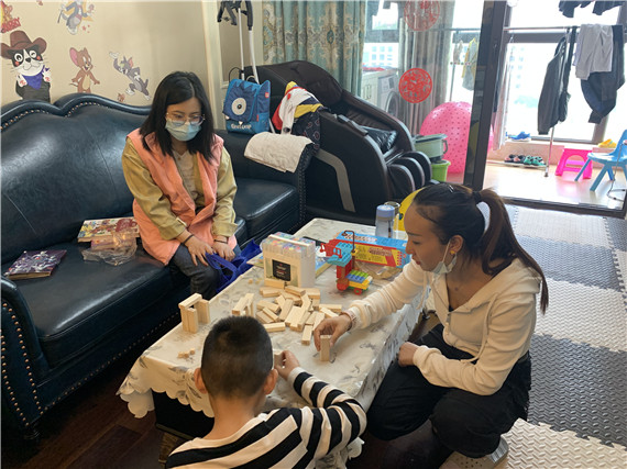 社區(qū)志愿者帶著孩子感興趣的“疊疊樂”益智積木、書籍等用品來到了自閉癥兒童家庭,孩子對積木十分感興趣,當(dāng)即拆開動手疊了起來。志愿者一邊陪著孩子疊積木,一邊跟其親切地交談,孩子在志愿者的陪伴下漸漸露出真摯開心的笑臉。隨后,志愿者翻開準備的圖文故事書,開展互動式閱讀,通過聲情并茂的講故事,與孩子進行交流,志愿者鼓勵家長,相信在親人愛的陪伴下,自閉癥兒童也能享有終身受用不盡的閱讀樂趣。家長對志愿者的到來表示十分感謝,謝謝社區(qū)對孩子的關(guān)愛,給孩子帶來了歡樂,也讓家長明白了要讓孩子更多地接觸外界,才能一步一步達到最終“融合”的目標(biāo)。