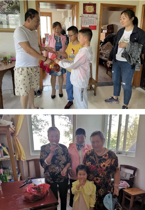 隨后,志愿者們各自分組領著親子家庭帶著香粽香囊進行上門慰問。“程奶奶,端午節(jié)快到了,祝您端午節(jié)快樂啊!小區(qū)現(xiàn)在開展三全家庭教育支持行動,孩子們跟隨我們一起來給您送粽子和香囊。”獨居老人程桂英老奶奶看到端木銘熙小朋友的到來,驚訝、興奮地雙手捂著嘴不住地表示感謝;癱瘓在床的江奶奶看到志愿者及孩子們的慰問,流下了高興地淚水;因眼部殘疾看不見的湯寶玉伯伯用手觸摸孩子們送的粽子香囊,激動地說不出話來;獨居退伍老兵楊志才老人拄著拐杖目送志愿者及孩子們,眼神中流露出激動目光......