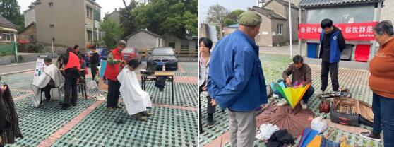 另外,義賣會現(xiàn)場還聯(lián)合了和平社區(qū)社會組織培育指導中心,他們請到了村里的老手藝人朱宜發(fā)為居民愛心理發(fā)。還有期頤養(yǎng)老服務(wù)中心特地邀請到了湖熟醫(yī)院的兩位院長前來助陣,為來場的居民做健康義診。磨刀、磨剪刀的攤位上人流不斷,不停的有居民把自家的刀拿過來打磨,還高興的討論著現(xiàn)在政策好,便民服務(wù)都到了家門口。修傘的師傅也說,這次修了十幾把傘,來的居民很客氣,都表示特別感謝。理發(fā)的兩位師傅更是忙得不停歇,一個個排隊居民都在排隊等候。活動中工作人員和手工坊志愿者拿著喇叭盡情地吆喝著,周六的上午若城村非常的熱鬧,來往的社區(qū)居民都被吸引過來,現(xiàn)場氛圍霎時變得非?;钴S,當大家了解這次義賣活動的所賣善款將全部用于慰問社區(qū)內(nèi)困境兒童、孤寡老人時,大家都紛紛慷慨解囊,獻出自己的一份愛心。
