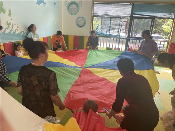 活動中,家長和小朋友們興致高昂,在音樂和兒歌的伴奏下,大家跟著老師進(jìn)行了《親子律動操》和彩虹傘小游戲,在老師的帶領(lǐng)下,家長和孩子們一起跟著音樂律動起來,相互配合,增強(qiáng)了孩子們的手眼協(xié)調(diào)能力、平衡感和前庭覺功能,增進(jìn)親子間的互動與溝通。通過家長和孩子共同游戲,有助于小朋友的早期智力開發(fā),同時幫助家長更加科學(xué)全面的了解孩子,引導(dǎo)家長開展良好的家庭教育。