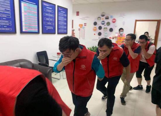 在掌握了基本的理論和實(shí)際操作技能后,隨著現(xiàn)場濃煙冒起,演練正式開始,大家聽到引導(dǎo)員的指示后,紛紛拿著濕毛巾捂著口鼻,貓著腰,扶著墻,有序快速地從樓道內(nèi)撤退到空曠的路面,順利完成消防逃生演練。