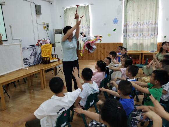 此次新時代文明實踐站走進(jìn)燕子磯幼兒園,并邀請棲圖表演團(tuán)隊表演原創(chuàng)木偶劇《葉公好龍》,該劇將中國傳統(tǒng)故事與皮影戲、提線木偶相結(jié)合,富有涵義且不失趣味。