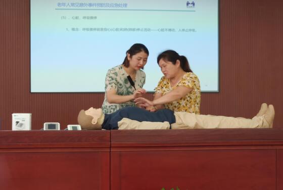 紙上得來終覺淺,在培訓(xùn)的最后,老師教家屬們上臺實際演練護(hù)理和急救的簡單方法。此次參加學(xué)習(xí)的學(xué)員中,有一位叫孟枝平的居民表現(xiàn)突出,她是一名肢體三級殘疾人,雖然腿腳不方便,但堅持報名培訓(xùn)。“我在會上學(xué)到了很多救人的辦法”,她向大家展示了遇到老人突發(fā)心梗的CPR急救方法,還有食物梗阻時的救助動作。“搶黃金四秒,也許用不上,但這個技能一定要會,”她積極上臺操作,配合老師教學(xué),學(xué)習(xí)進(jìn)步很快。