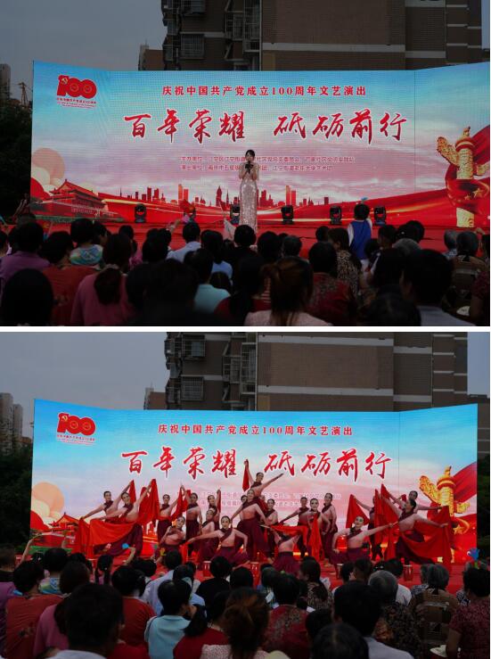 文藝晚會在舞蹈《中國紅》中拉開序幕,喜慶的綢帶揮灑開來,仿佛霞光映照天際。在熱鬧聲中,居民們聆聽了富有地方特色的民樂合奏《洪湖水浪打浪》、《瀏陽河》,聆聽了飽含深情的女聲獨唱《毛主席的話記心上》和詩朗誦《百年黨旗耀中華》。悠揚的樂曲扣人心弦,歡快的舞蹈和群口快板也如鼓點密集襲來,舞蹈《花鼓聲聲慶百年》、群口快板《社區(qū)防控疫情》等充滿了快活的氣氛,給現場觀眾帶來了一場視聽盛宴,贏得掌聲陣陣。