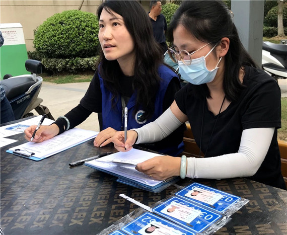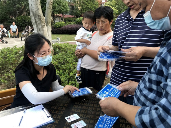 社區(qū)人員對電動車主人發(fā)放新牌選號