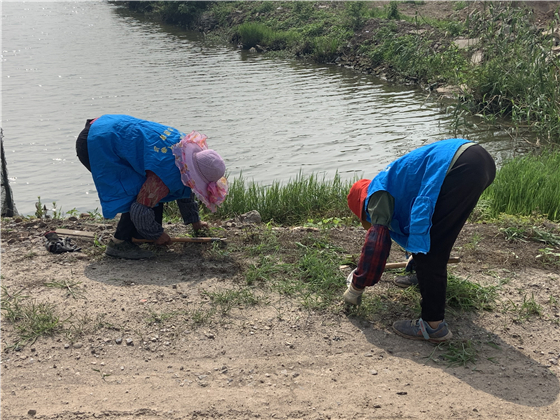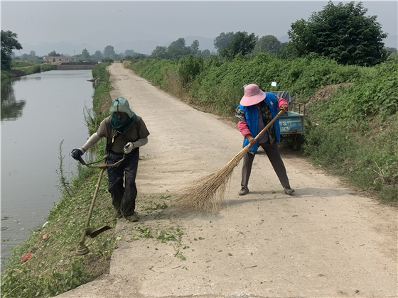 花園村集中組織10名城市志愿者,動用割草機3臺,對靖安河沿岸雜草進行清除;利用釘耙、網(wǎng)兜等作業(yè)工具,打撈河內(nèi)的水生植被和漂浮物;并將清理的雜草雜物聚集岸邊,集中統(tǒng)一清運。