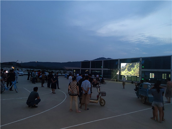 夜幕降臨,勞碌了一天的建筑工人們正清洗著泥土與汗水,看到放映工作人員的到來(lái),工友們?nèi)宄扇海奂趶V場(chǎng)上等待著電影的播放。隨著電影開(kāi)始放映,熱鬧的現(xiàn)場(chǎng)很快就安靜下來(lái)。大家紛紛坐好,進(jìn)入“觀影模式”,聚精會(huì)神地觀看紅色電影《金剛川》,讓堅(jiān)守在建設(shè)一線的工友們共同參與到黨史學(xué)習(xí)教育活動(dòng)當(dāng)中,共同重溫黨的光輝歷程,接受紅色文化洗禮。現(xiàn)場(chǎng)不少工友還拿出手機(jī)將放映場(chǎng)景拍照發(fā)給親朋好友、發(fā)布朋友圈,分享觀影的感想。