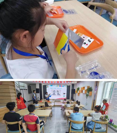 一張擁有不同動(dòng)物部位的彩紙,如何把它們變成一個(gè)完整的動(dòng)物呢?科普活動(dòng)現(xiàn)場(chǎng),橋頭社區(qū)的工作人員引導(dǎo)著孩子們進(jìn)行著思考。作為這次“小魔盒”制作成功的關(guān)鍵條件,光的折射是必須要掌握的知識(shí)。從不同的圖片、日常生活示例入手,工作人員將其中原理介紹給小朋友們,讓他們能從身邊事思考其中隱藏的知識(shí)。從卡片剪裁到內(nèi)盒與外盒的拼接,再到最終成像,在工作人員的耐心講解下,小朋友們最終成功將分散的部分拼成了一個(gè)個(gè)可愛(ài)的動(dòng)物頭像。