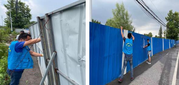 社區(qū)接到電話后,第一時間組織了城市治理志愿者帶上工具趕赴崗龍路,確定情況屬實后,志愿者們隨即用電鉆、鉗子、鐵絲等工具將倒伏和破損的圍擋進行修繕、固定。因為天氣惡劣,大風給志愿者們的工作增添了阻力,但他們沒有怨言,認真工作,互相配合,通過一個多小時的努力,圍擋得到修復(fù),方便了來往行人、車輛的通行,同時也為他們提供了有效的安全保障。