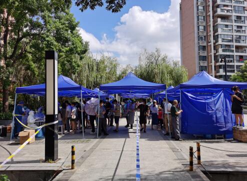 社區(qū)人員積極響應(yīng)號(hào)召,早早地到達(dá)檢測(cè)地點(diǎn)排隊(duì),等待進(jìn)行核酸檢測(cè)。天氣炎熱,很多人全副武裝,在太陽底下排隊(duì),隊(duì)伍排得很長(zhǎng)。檢測(cè)分兩部分,一部分是登記信息進(jìn)行分組領(lǐng)取條形管,另一部分則是正式采樣。因?yàn)楹臅r(shí)長(zhǎng),保安人員為了大家的身體著想,給大家拉來了遮陽的大棚,也給大家發(fā)放了飲用水。炎炎夏日,大家都汗流浹背,但是都在為了身體的健康以及疫情的防控努力。