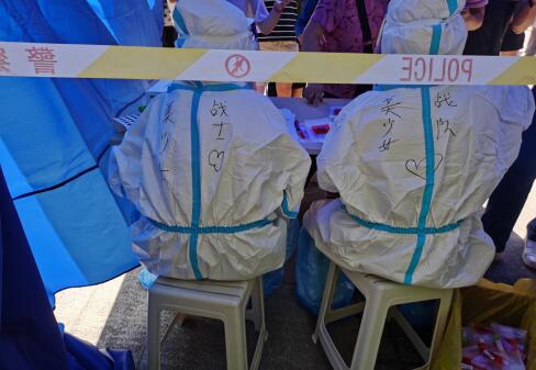 與此同時(shí),醫(yī)護(hù)人員穿著一層層的防護(hù)服,堅(jiān)守著工作崗位,一絲不茍地為大家進(jìn)行核酸采樣。取出棉簽,讓大家張嘴,前后過程很迅速,但這也是醫(yī)護(hù)人員工作辛苦熟練以及被檢測(cè)人員積極配合的體現(xiàn)。有兩個(gè)醫(yī)護(hù)人員的防護(hù)服上寫著美少女戰(zhàn)士,呼應(yīng)了當(dāng)下的情形,也給緊張的核酸檢測(cè)工作增添了一份色彩。