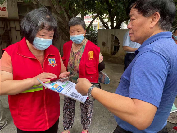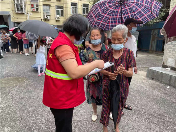 家住堯安新村小區(qū)的陳婷同志是一名退休的黨員干部。在沒(méi)有外墻的老舊車(chē)棚里,醫(yī)護(hù)人員在里面做核酸檢測(cè),陳婷就和其他志愿者們?cè)谛^(qū)巡查,勸導(dǎo)居民響應(yīng)號(hào)召,來(lái)做核酸檢測(cè)。烈日炎炎,大家在小區(qū)巡走半圈就汗流浹背,每天工作10多個(gè)小時(shí),志愿者馬甲都能擰出水。