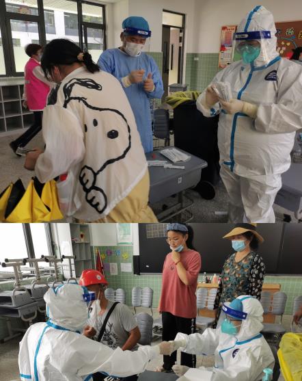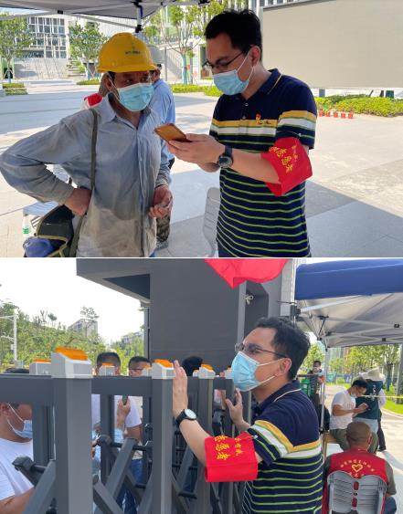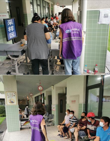 西花社區(qū)工作人員與棲發(fā)物業(yè)黨支部黨員志愿者于7月29日早5點(diǎn)30分就已在華僑城小學(xué)檢測(cè)點(diǎn)做好準(zhǔn)備。他們?cè)诘谝粫r(shí)間下沉到核酸檢測(cè)點(diǎn),協(xié)助醫(yī)護(hù)人員登記信息、維持秩序、分流人員、設(shè)置綠色通道等,只為加速檢測(cè)進(jìn)程,減少居民等待時(shí)間。