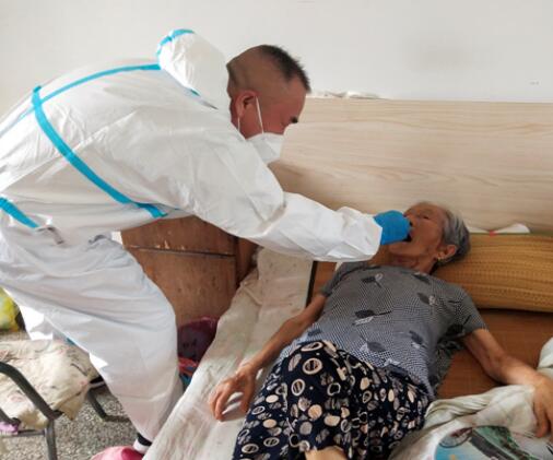 在上門進(jìn)行核酸檢測(cè)的過程中,工作人員對(duì)因?yàn)樯眢w原因不方便到現(xiàn)場(chǎng)進(jìn)行檢測(cè)的高齡癱瘓老人細(xì)致入微地進(jìn)行采樣工作,對(duì)于高齡癱瘓老人,工作人員與醫(yī)護(hù)人員給予了更多的耐心與關(guān)懷。