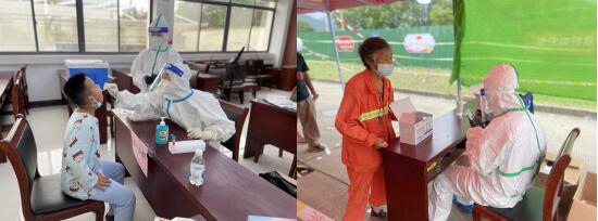 天然村的社區(qū)工作人員、醫(yī)護(hù)人員和志愿者們再次奮戰(zhàn)在一線,爭分奪秒地為社區(qū)群眾進(jìn)行核酸檢測。烈陽高照下,醫(yī)護(hù)人員們被防護(hù)服包裹地嚴(yán)嚴(yán)實實的身軀,早已大汗淋漓。