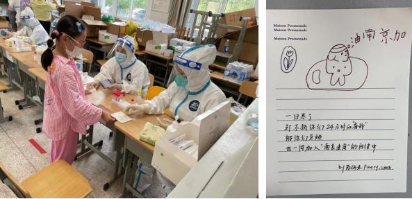 “偶然的相遇,與你相處只是短暫的兩聲‘啊’,似乎是精心設(shè)計(jì),盡量拖長的聲線里,只是平靜、沉穩(wěn)……”“一日盡了,卻不抵你們24小時(shí)的奮戰(zhàn),被你們點(diǎn)燃,也一周加入‘南京速度’的自律中。”……8月6日,在南京市江寧區(qū)淳化街道淳化社區(qū)淳化中學(xué)核酸檢測點(diǎn),社區(qū)工作人員、醫(yī)護(hù)人員收到了這樣一張張充滿鼓勵(lì)話語的愛心卡片。