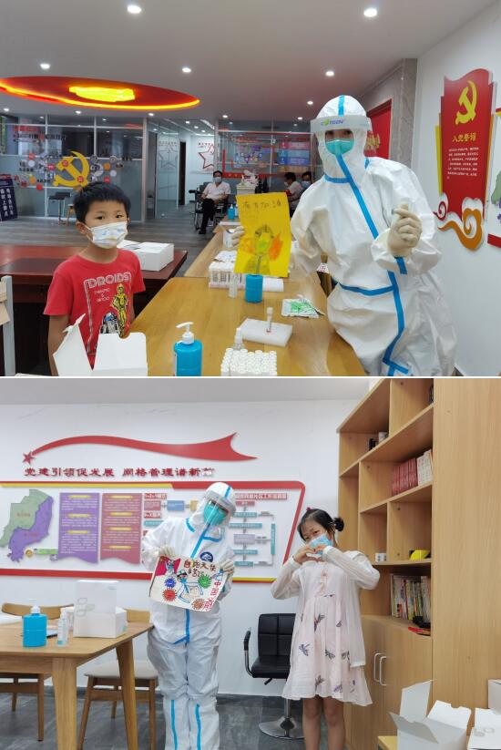 “白衣天使辛苦了!”“致敬逆行者!”……8月13日,在南京市江寧區(qū)湖熟街道徐慕村楊家核酸采集點,周崗小學(xué)的學(xué)生們?yōu)獒t(yī)護(hù)人員送來了自己親手繪畫的作品,表達(dá)對一線工作者的感激與敬佩之情。
