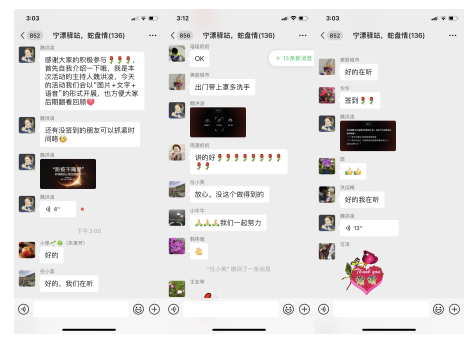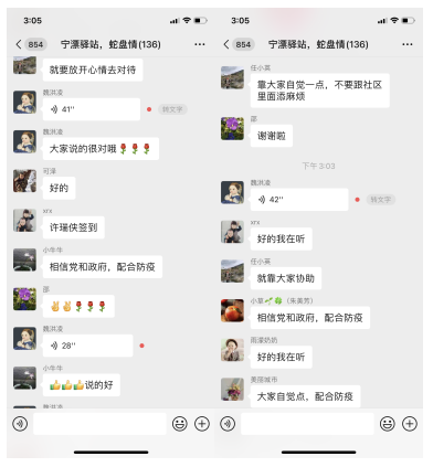 線上服務(wù)中,采用文字+圖片+語音方式開展。指導(dǎo)老師首先指出大家情緒焦慮的原因與應(yīng)對方式,隨后就大家普遍關(guān)注的健康、親子關(guān)系、就業(yè)、個性化需求問題提供相關(guān)建議與解決思路,獲得了參與居民的一致認可,大家也在群內(nèi)分享起自己解決各類問題的經(jīng)驗,紛紛表示會積極配合防疫各項工作,共戰(zhàn)疫情。