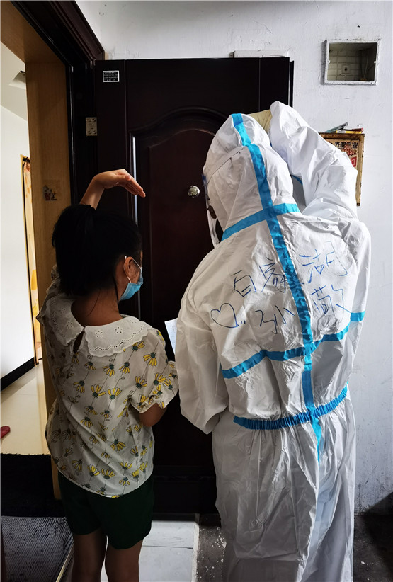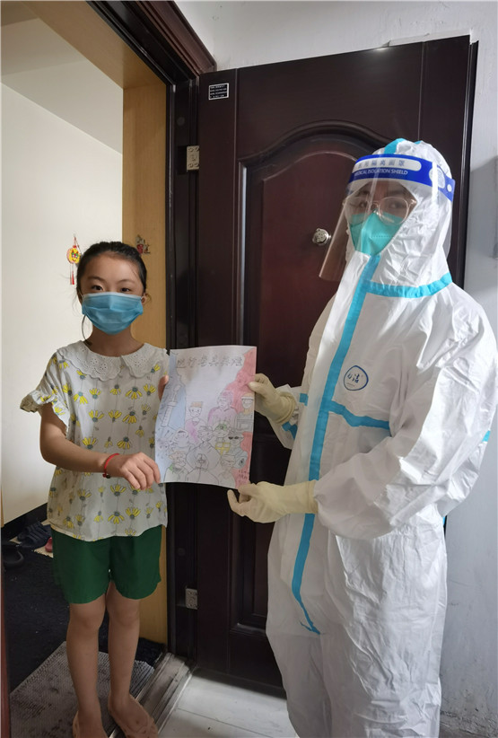 我們的“大白”醫(yī)務姐姐上門給居民做核酸的路上,收到了一份禮物,是來自南京市江寧區(qū)秣陵街道長山社區(qū)楊虞欣小朋友自己親手畫的畫送給了核測醫(yī)務人員,并向他們豎起大拇指,送上了自己的心意。