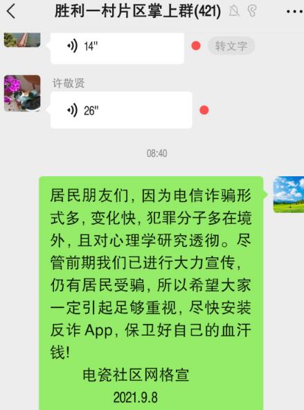 “居民朋友們,因為電信詐騙形式多,變化快,犯罪分子多在境外,且對心理學(xué)研究透徹,所以希望大家要引起足夠重視,盡快安裝反詐APP……”在居民微信群里,該社區(qū)的民警網(wǎng)格員們廣泛宣傳、多次強調(diào)反詐知識,引起居民的警惕和注意。