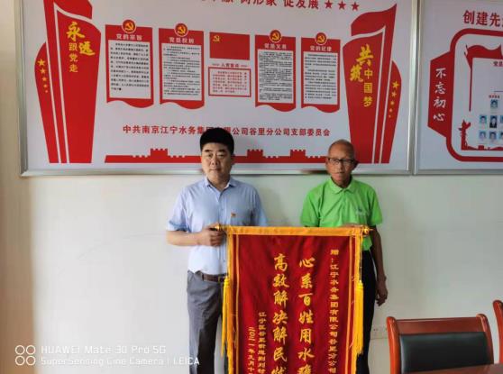 9月15日,南京市江寧區(qū)谷里街道荊劉村一名老黨員將一面寫有“心系百姓用水難,高效解決解民憂”的錦旗送到了水務集團谷里分公司總經(jīng)理金海濱那里,真誠感謝他帶領(lǐng)員工徹底解決荊劉村民的”老大難“。