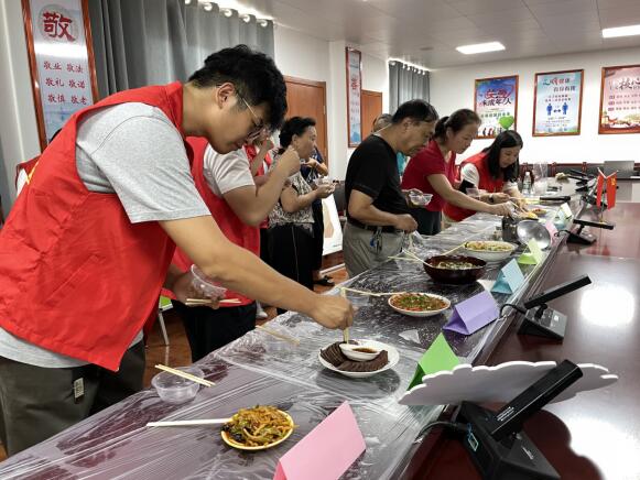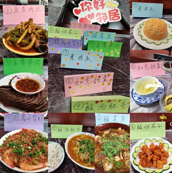 活動(dòng)當(dāng)天,居民們端著自家的拿手好菜,早早地到了活動(dòng)室擺放好,魚(yú)香肉絲、五香牛肉、蒜蓉開(kāi)背蝦、酸湯肥牛、酸菜魚(yú)、如意甜羹、素雞瓜、酸甜茄子等來(lái)自各個(gè)家庭的菜品把桌上的空位填滿,讓本場(chǎng)活動(dòng)燃起一絲絲的火花。