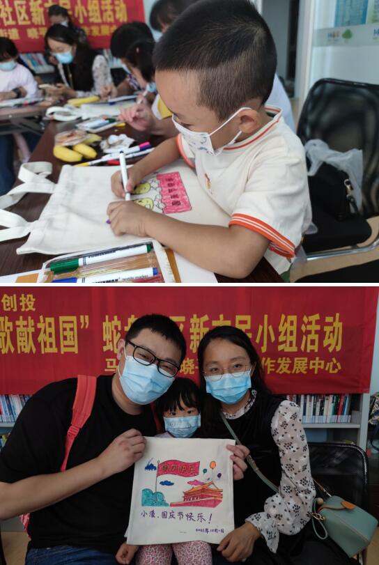 活動(dòng)中,工作人員帶領(lǐng)小朋友們認(rèn)識(shí)國(guó)旗、國(guó)徽的特征,了解我國(guó)國(guó)歌《義勇軍進(jìn)行曲》,大家一同高唱國(guó)歌,祝福祖國(guó)繁榮昌盛。隨后,小朋友們?cè)诩议L(zhǎng)的幫助下,繪制環(huán)保袋,用豐富的色彩和元素表達(dá)對(duì)祖國(guó)的感情。經(jīng)過(guò)精心繪制,帆布袋變成一個(gè)個(gè)獨(dú)一無(wú)二又可愛(ài)的藝術(shù)品。大家紛紛與自己的作品合影留念。