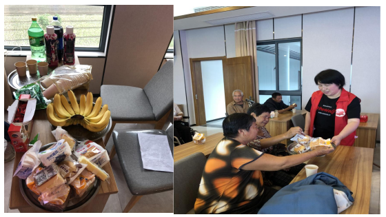 尊老敬老是中華民族的傳統(tǒng)美德,能夠?qū)⒆约旱囊环輴?ài)心奉獻(xiàn)給這里的殘疾老人們,志愿者們也非常開(kāi)心,秉承著“尊老敬老”的原則,我們特地在現(xiàn)場(chǎng)擺放了一些水果、零食和飲品,給予老人們享用。考慮到殘疾老人們行動(dòng)不便,社區(qū)殘疾人之家工作人員及志愿者一一將準(zhǔn)備好的食物分發(fā)到老人手中。