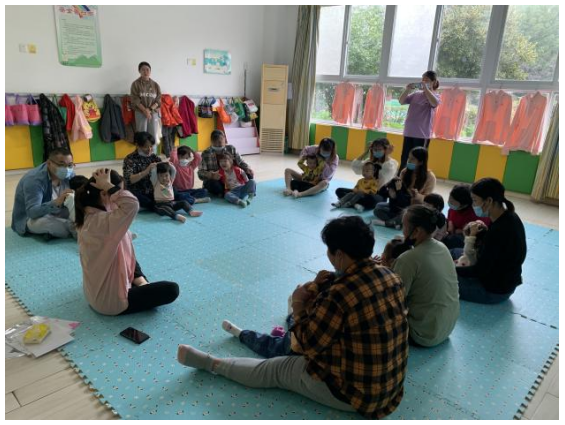 “熱身”準備完成后,白云老師帶著寶寶們開始了第一個游戲:小手拍拍,音樂響起來:“小手拍拍,小手拍拍,小手拍拍,手指伸出來,手指伸出來,眼睛在哪里,眼睛在這里。用手指出來,用手指出來,小手拍拍,小手拍拍,手指伸出來,手指伸出來,鼻子在哪里,鼻子在這里。用手指出來,用手指出來。”并面向大家做出了示范,寶寶聽到音樂后都不自覺地跟著扭動起來,歡快地隨著音樂指出位置;第二個游戲是《講衛(wèi)生(音樂律動)》:“打開水龍頭,淋濕小小手,擦擦小肥皂,相對搓搓手。手心對手背,相互搓一搓?;ノ沾竽粗?,相互轉(zhuǎn)轉(zhuǎn)轉(zhuǎn),指關節(jié)彎彎腰,掌心上面來搓搓。手腕洗一洗,龍頭沖一沖。關緊擦干凈,細菌全跑掉。”寶寶們跟著白云老師一起互動起來,在這個過程中,家長們幫助寶寶一起扭動著身體,體驗了其中的有趣和快樂,同時也加強家長對孩子衛(wèi)生習慣養(yǎng)成層面的認識。