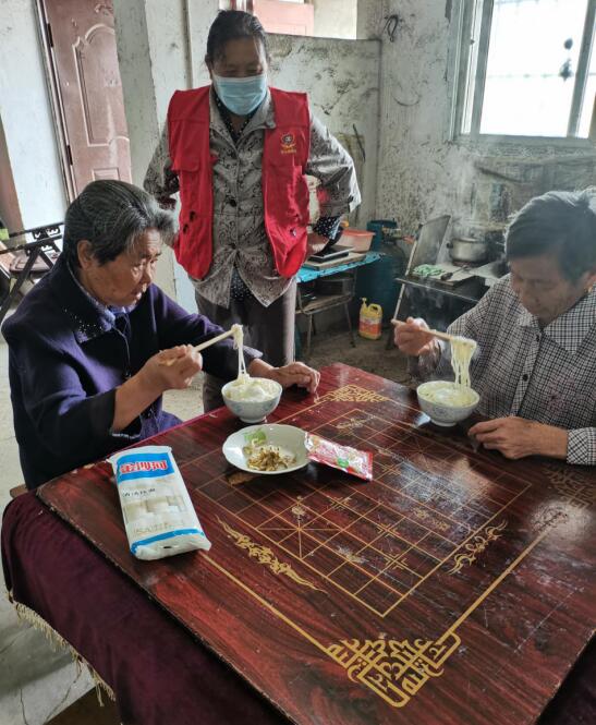 當(dāng)天,志愿者們來(lái)到了轄區(qū)內(nèi)的老年人們家中,將帶來(lái)的掛面、雞蛋、洗衣液等生活用品送到了他們的手上,同時(shí)祝福他們節(jié)日快樂(lè),也祝愿他們身體健康。在聊天時(shí),志愿者聽到有老人說(shuō)還沒(méi)有吃飯,就熱情地幫他們煮了份面,還打了一個(gè)荷包蛋,讓這碗代表著長(zhǎng)長(zhǎng)久久幸福生活的掛面溫暖老年人的心扉。