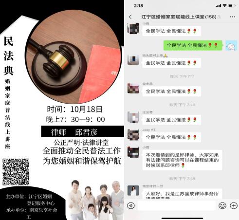 為進(jìn)一步做好《中華人民共和國(guó)民法典》“婚姻家庭篇”普法宣傳,提升家庭的法律知識(shí)水平及家庭糾紛調(diào)處能力,10月18日晚,江寧區(qū)婚姻登記服務(wù)中心聯(lián)合南京樂(lè)享社會(huì)組織舉辦了“《中華人民共和國(guó)民法典》婚姻家庭篇”線上普法課堂,近150人參與了聆聽(tīng)。