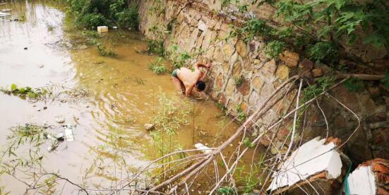 發(fā)現(xiàn)這種情況后,村委會主任張義林來到這附近,不顧雨后寒冷的天氣和冰涼的河水,毅然脫完了衣服,跳進河里,沿著河道去摸排水口的位置。在仔細的摸找后,他終于找到了排水口,于是伸手進去,一把一把地將雜物逐一掏出,感受到了積水的流動,放下心來后才忍不住打了幾個寒顫。