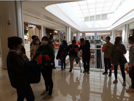 八點(diǎn)半,三十多名殘疾人已到達(dá)影院門口,工作人員為大家發(fā)放影票及小紅旗。