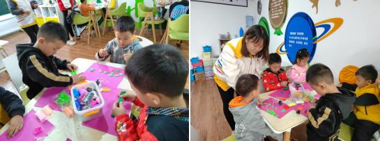 當天,家長們帶這些孩子們來到尚趣樓,交給在門口等候的志愿者,孩子們在志愿者的帶領(lǐng)下,來到二樓參與活動。在活動室內(nèi),志愿者拿出提前準備好的超輕黏土發(fā)給孩子們,并向孩子們介紹了它們的用法,讓他們充分發(fā)揮自己的想象力,捏出自己想要的樣子。在志愿者的引導下,孩子們將不同顏色的黏土捏出不同的形狀,將他們粘在厚卡紙上,有的孩子用綠色的黏土捏成小草,在卡紙上粘貼成草坪,有的孩子用粉色、黃色、紫色捏成五顏六色的花朵,還有的孩子用橙色的黏土捏成蜜蜂,又創(chuàng)意性地粘上了胡子和眼鏡。孩子們互相交流著自己的創(chuàng)意和作品,現(xiàn)場的氛圍開心極了。