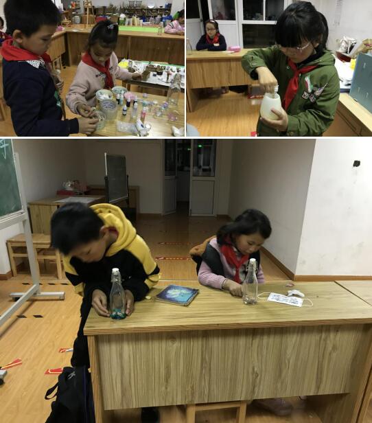 活動(dòng)中,老師帶著同學(xué)們進(jìn)行了科學(xué)實(shí)驗(yàn),教會(huì)他們制作一個(gè)星辰大海主題的夢(mèng)想瓶。大家先選擇自己夢(mèng)想瓶中的配飾:海螺、彩石、小星星、小珍珠、小花朵等,再挑選自己的主題顏色,將AB膠混合攪拌,注入瓶?jī)?nèi),一個(gè)彩色的夢(mèng)想瓶就制作完成了。拿著承載星辰大海的夢(mèng)想的玻璃瓶,同學(xué)們的心中充盈著成就感、新鮮感和對(duì)未來(lái)滿(mǎn)滿(mǎn)的期待。