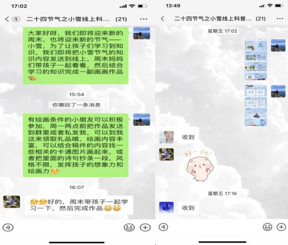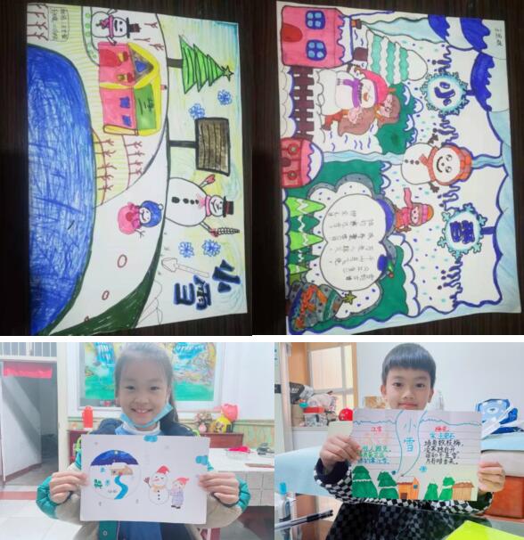 在線下,小朋友們拿出畫筆,充分發(fā)揮想象力,一幅幅充滿童真趣味的童畫便“新鮮出爐”,大家爭先恐后地將自己的作品發(fā)到群里,展示著自己對小雪浪漫邂逅的期待。