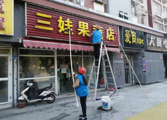 招牌不僅是每家沿街店鋪的臉面和名片,更是展示城市形象的重要窗口。清洗現(xiàn)場(chǎng),志愿者們通過(guò)提前的安排部署,秉持著不漏一戶商戶不差一塊招牌的宗旨。拿著水槍和長(zhǎng)桿拖把,仔仔細(xì)細(xì)地清洗著所有的門頭招牌,經(jīng)過(guò)水槍的沖洗,所有的招牌都煥然一新。在對(duì)商戶門頭進(jìn)行大清洗時(shí),志愿者也積極動(dòng)員沿街商戶對(duì)各自“門前三包”區(qū)域進(jìn)行清掃、除塵,整理堆放雜物,讓臨街道路更加干凈整潔。
