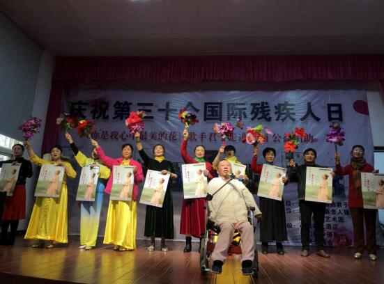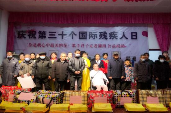 君子老師自強(qiáng)不息的故事深深激勵(lì)著現(xiàn)場(chǎng)的殘疾人朋友,君子的愛心之路令現(xiàn)場(chǎng)觀眾備受感動(dòng)。君子現(xiàn)場(chǎng)演唱了歌曲《活出個(gè)樣來(lái)給自己看》、《你是我心中最美的花》兩首歌曲,百名觀眾硬是讓君子唱出了萬(wàn)人演唱會(huì)的氛圍,大家全體起立,揮舞著雙手,氣氛實(shí)在是火爆。鎮(zhèn)郊藝術(shù)團(tuán)和當(dāng)?shù)氐膼坌乃囆g(shù)家們?yōu)楝F(xiàn)場(chǎng)觀眾表演了《感恩的心》、《愛的奉獻(xiàn)》舞蹈等十多個(gè)精彩紛呈的節(jié)目。十月份機(jī)構(gòu)工作人員和灌南公益團(tuán)隊(duì)取得聯(lián)系,灌南公益團(tuán)隊(duì)通過(guò)一個(gè)月的走訪了解,征集了20位困難殘疾人,活動(dòng)現(xiàn)場(chǎng)為20戶貧困殘疾人發(fā)放生活物資,為他們送上來(lái)冬日里的溫暖。