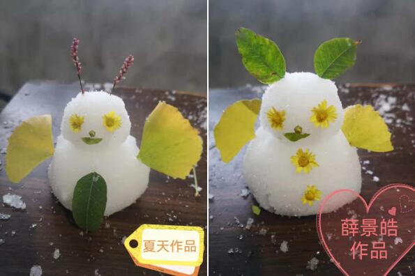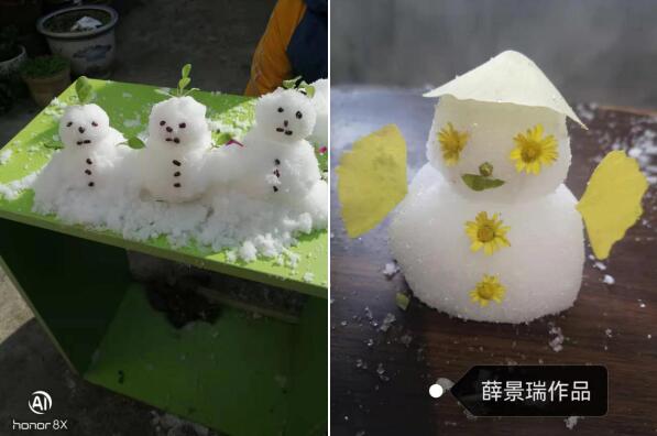 值得一提,為了確保孩子們都能參與其中,活動(dòng)前期,社區(qū)工作人員還給孩子分發(fā)了堆“雪人”的材料,在家長(zhǎng)的幫助下,孩子發(fā)散思維,在潔白而唯美的“雪”里來(lái)了一場(chǎng)冬日之旅。戴著小草帽的三口之家結(jié)伴在曬太陽(yáng),一只潔白的貓依偎在身旁,邊上還有一只酣睡的豬。家里來(lái)客人了,他們用金黃的銀杏葉和菊花裝飾著自己,興高采烈而來(lái)……