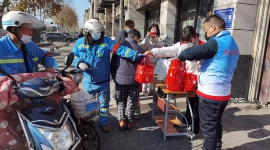 工作人員們帶著餃子和其他慰問(wèn)品來(lái)到戶外,支起桌子,為環(huán)衛(wèi)工、民警、外賣小哥送去。紅通通的袋子中,熱騰騰的手工餃子,蘊(yùn)含著真誠(chéng)和祈愿,為戶外工作者送上一份感謝、一份祝福,一份冬日里的溫暖。