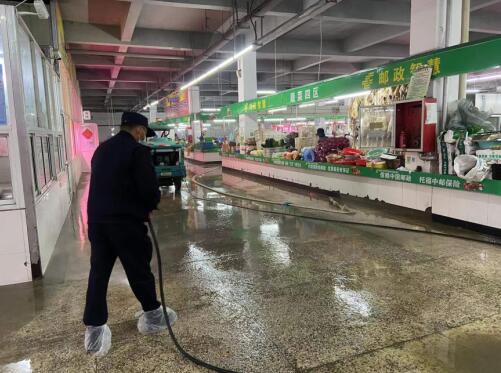 農(nóng)貿(mào)市場作為“菜籃子”,與群眾生活息息相關(guān)。執(zhí)法大隊(duì)始終堅(jiān)持把群眾安全放在第一位,高標(biāo)準(zhǔn)、嚴(yán)要求,持續(xù)做好農(nóng)貿(mào)市場監(jiān)管工作。一是時(shí)刻密切關(guān)注新冠肺炎疫情防控情況,按要求做好農(nóng)貿(mào)市場進(jìn)出口人員體溫測量、佩戴口罩等工作,督促市場方做好消毒消殺、通風(fēng)等措施;二是引導(dǎo)經(jīng)營戶將占用公共道路擺放的物品搬至店內(nèi),做到還路于民;三是不定期對(duì)市場內(nèi)排水溝進(jìn)行疏通、沖洗,協(xié)助市場方對(duì)市場內(nèi)地面、柜臺(tái)、墻壁等區(qū)域進(jìn)行清掃、沖洗、消毒等作業(yè)。