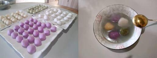 從微信群收到的圖片可以看出活動現(xiàn)場,每個家庭都積極參與,特別是孩子們包得十分認(rèn)真、躍躍欲試。她們跟著媽媽學(xué)得有模有樣,一手把面團(tuán)揉搓成小碗狀,一手用筷子往里頭放餡料,然后小心地把面團(tuán)搓勻……家長們用語音說、她們還創(chuàng)新方法事先將菠菜、紫甘藍(lán)、胡蘿卜榨汁、和糯米粉調(diào)色,使得做出來的湯圓色彩紛呈,讓人產(chǎn)生食欲,令人大快朵頤。從圖片中孩子們的笑臉可以看出,他們是在一片歡聲笑語中完成的。
