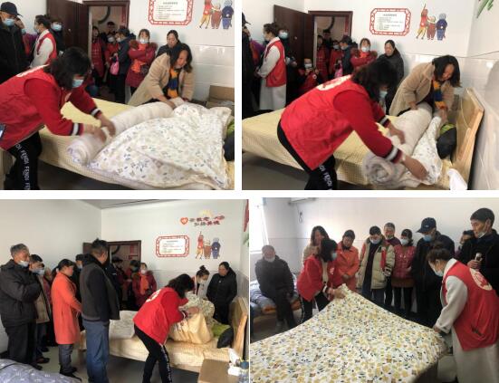 在河北社區(qū)殘疾人之家工作人員的帶領(lǐng)下,殘疾人來(lái)到殘疾人之家日間照料活動(dòng)室,學(xué)習(xí)套被套、疊被子、系鞋帶等日常生活技能。工作人員事無(wú)巨細(xì)的教導(dǎo)著殘疾人疊被子,并耐心手把手的將每一步驟都教給大家。