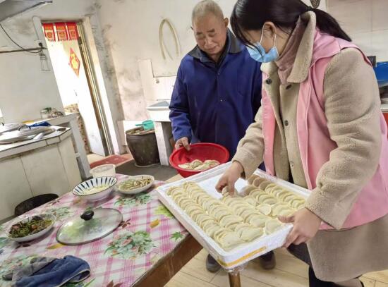 工作人員還將包好的餃子送給了附近的老人,每到一戶,志愿者陪老人拉家常,聊心聲,言語中透露著對老人們濃濃的關(guān)愛,到處洋溢著“家”的味道、“家”的溫馨。